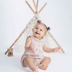 La combinaison Alice pour bébé est de couleur rose pâle, avec des manches courtes. Le tissu est doux et légèrement texturé. La tenue a un col en dentelle blanche avec un motif floral délicat, une bande centrale de dentelle blanche descend d’ailleurs jusqu’à la partie inférieure avec un nœud raccord. Les extrémités des jambes de la combinaison sont élastiquées pour un ajustement confortable.