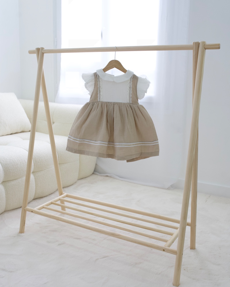Cette robe pour enfant est de couleur beige avec un haut blanc intégré. Sublime avec son col Claudine blanc, les manches de cette tenue sont courtes et en voile blanc, volantées.