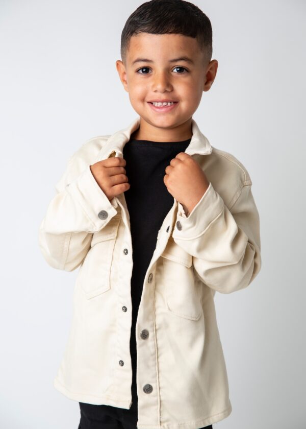 La chemise est de couleur beige clair, confectionnée dans un tissu durable. Elle présente une coupe décontractée avec un col classique et des manches longues. La chemise est dotée de boutons sur le devant, permettant de l’ouvrir ou de la fermer selon les préférences. De plus, elle possède deux poches poitrine à rabat, ajoutant une touche pratique et stylée. Le design simple et élégant en fait un vêtement polyvalent qui peut être porté seul ou en superposition.