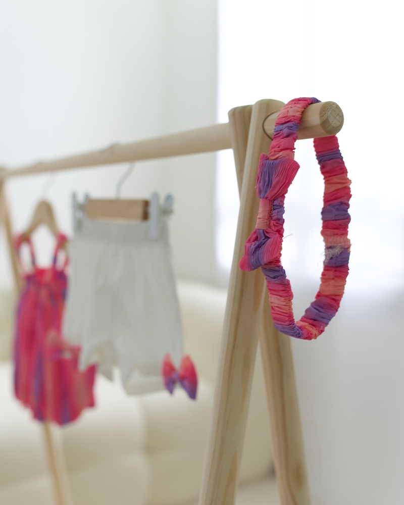 L’accessoire s’avère être un bandeau assorti, fait du même tissu plissé et multicolore que le haut et les nœuds du short. Un bandeau décoré d’un petit nœud, ajoutant une touche mignonne et coordonnée à l’ensemble.